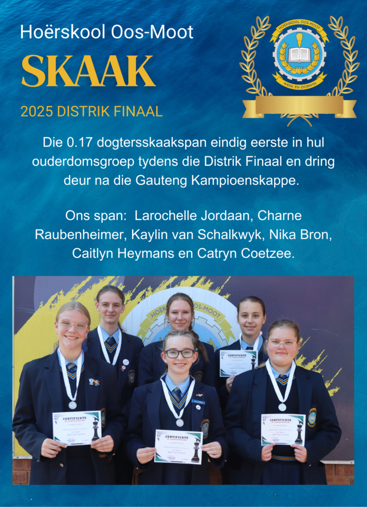 By Hoërskool Oos-Moot is skaak ’n sport wat denkvermoë vier, en ons spelers bewys jaarliks dat Oosies nie net op die sportveld nie, maar ook op die skaakbord die voortou neem.