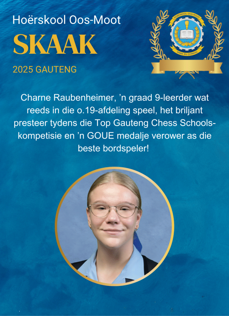 🥇♟️Charne Raubenheimer, ’n graad 9-leerder wat reeds in die o.19-afdeling speel, het briljant presteer en ’n GOUE medalje verower as die beste bordspeler! Haar talent en strategie het almal beïndruk en Oos-Moot se naam laat skitter!